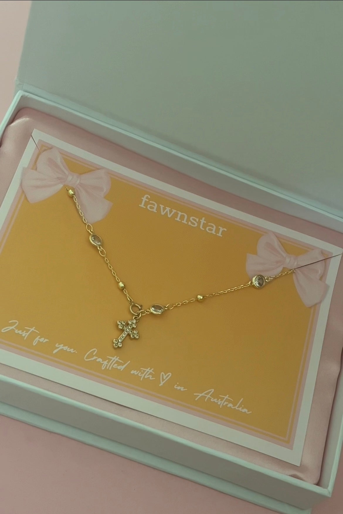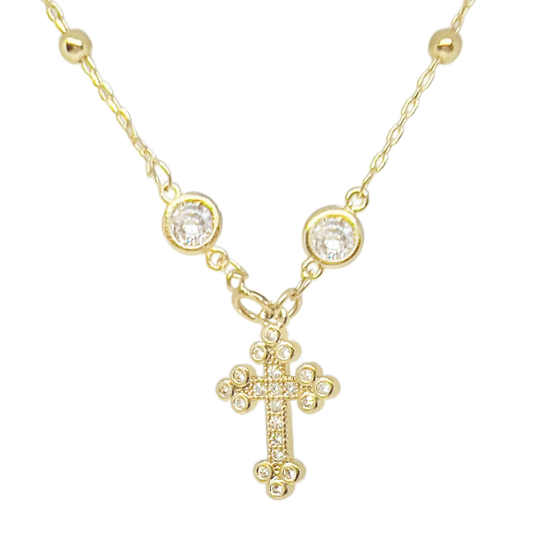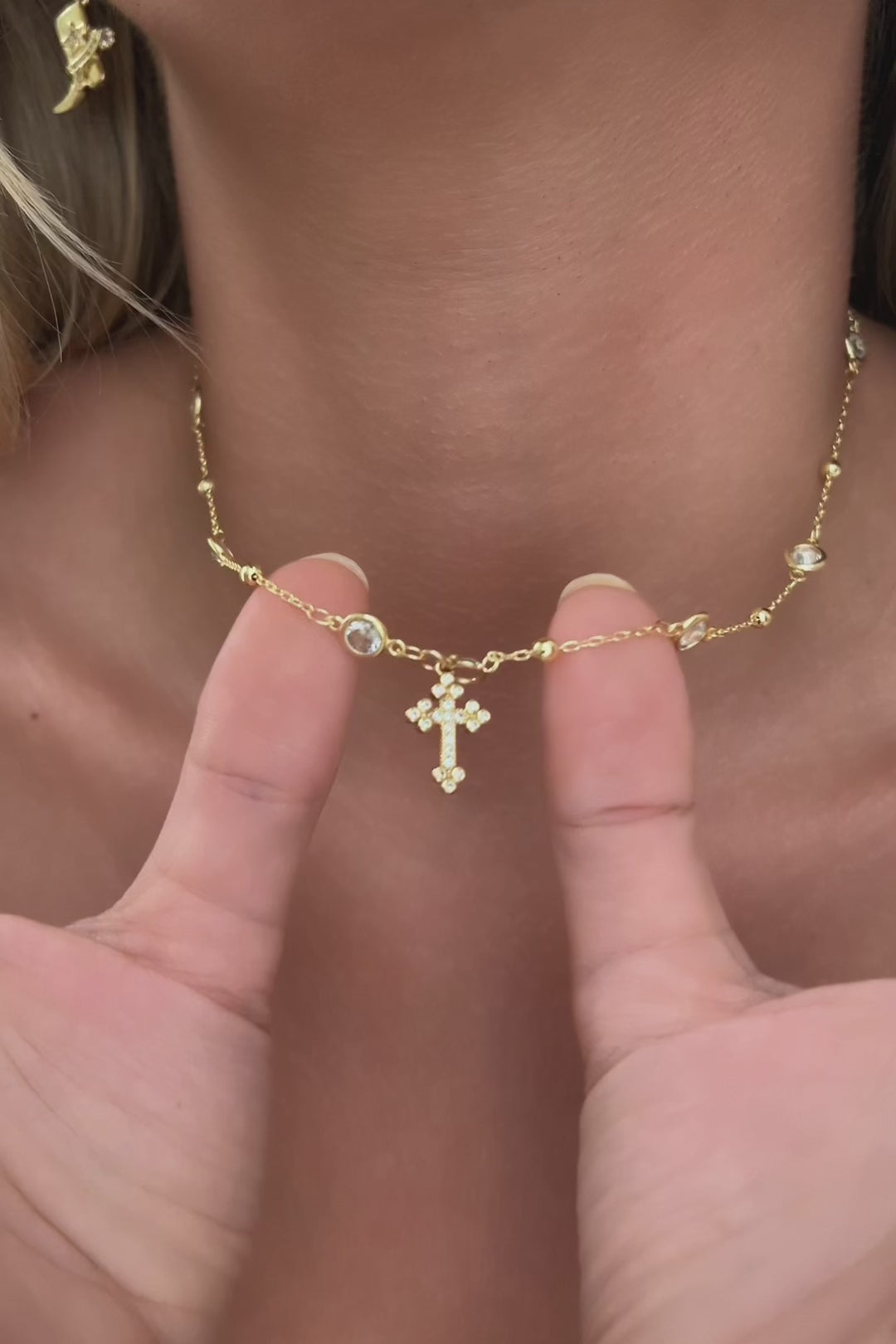 Absolute perfection for everyday wear. The Icon necklace features a petite satellite chain adorned embellished with circular diamond simulants and adorned with an 18k gold crucifix paved with diamond simulants.