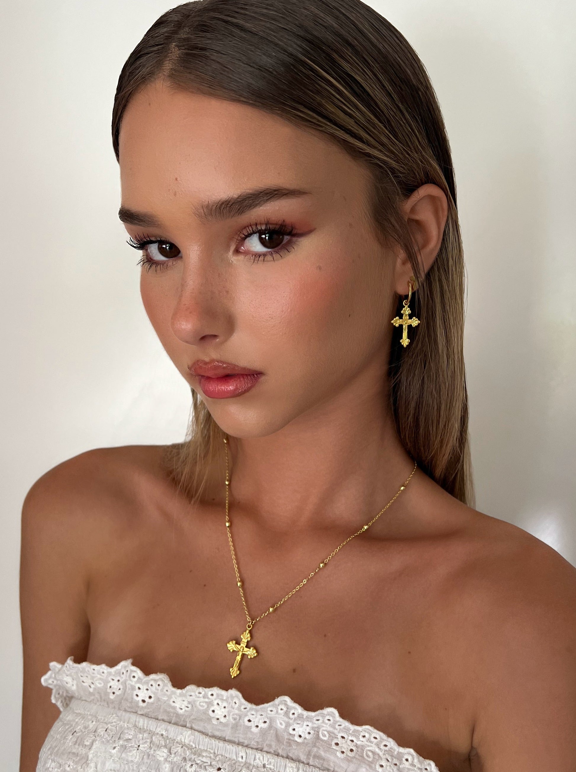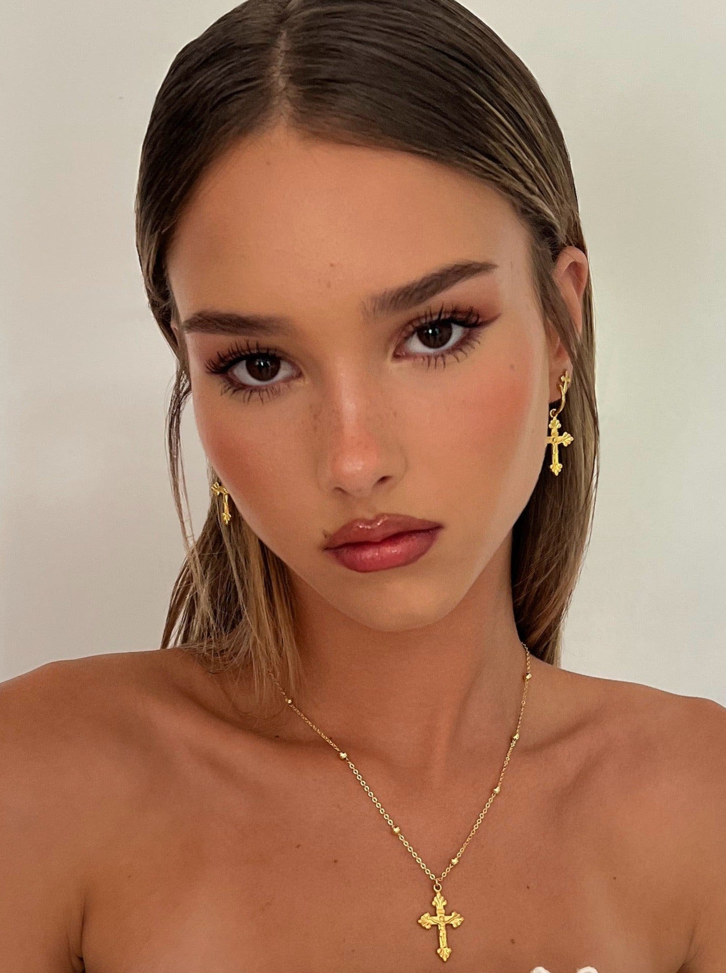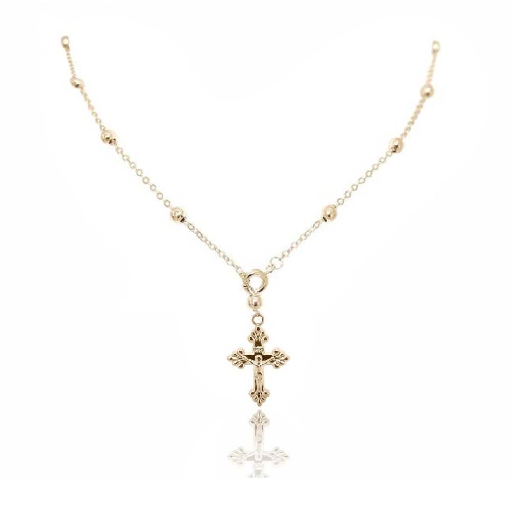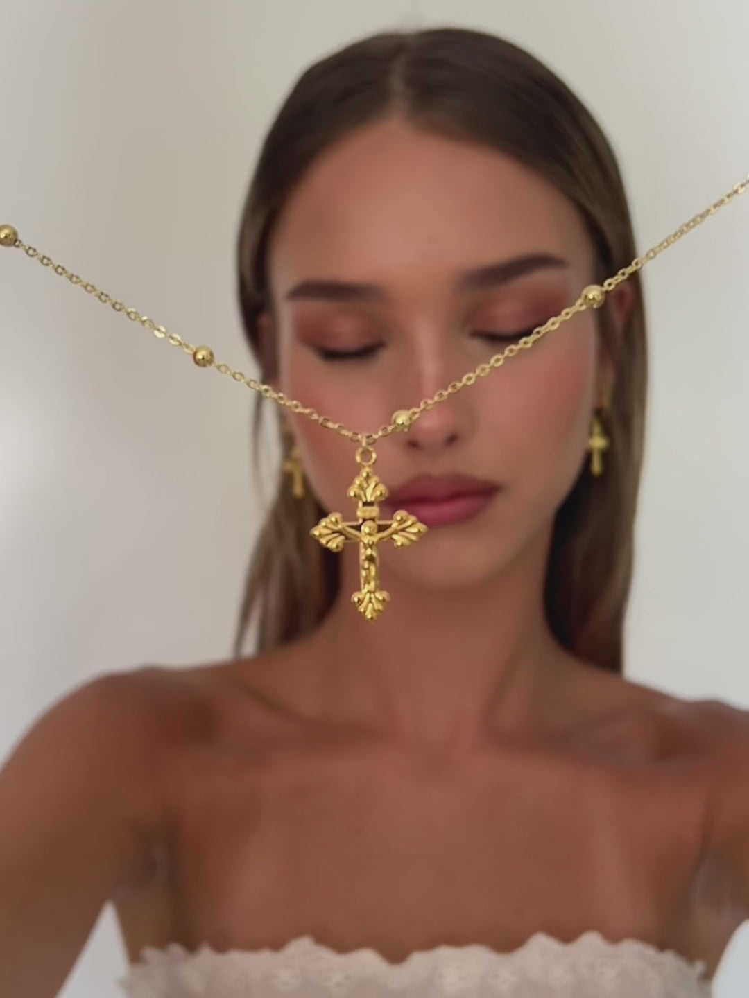 Absolute perfection for everyday wear. The Mishkah Necklace features a 18k petite ball chain embellished with an ornate carved 18k gold filled crucifix