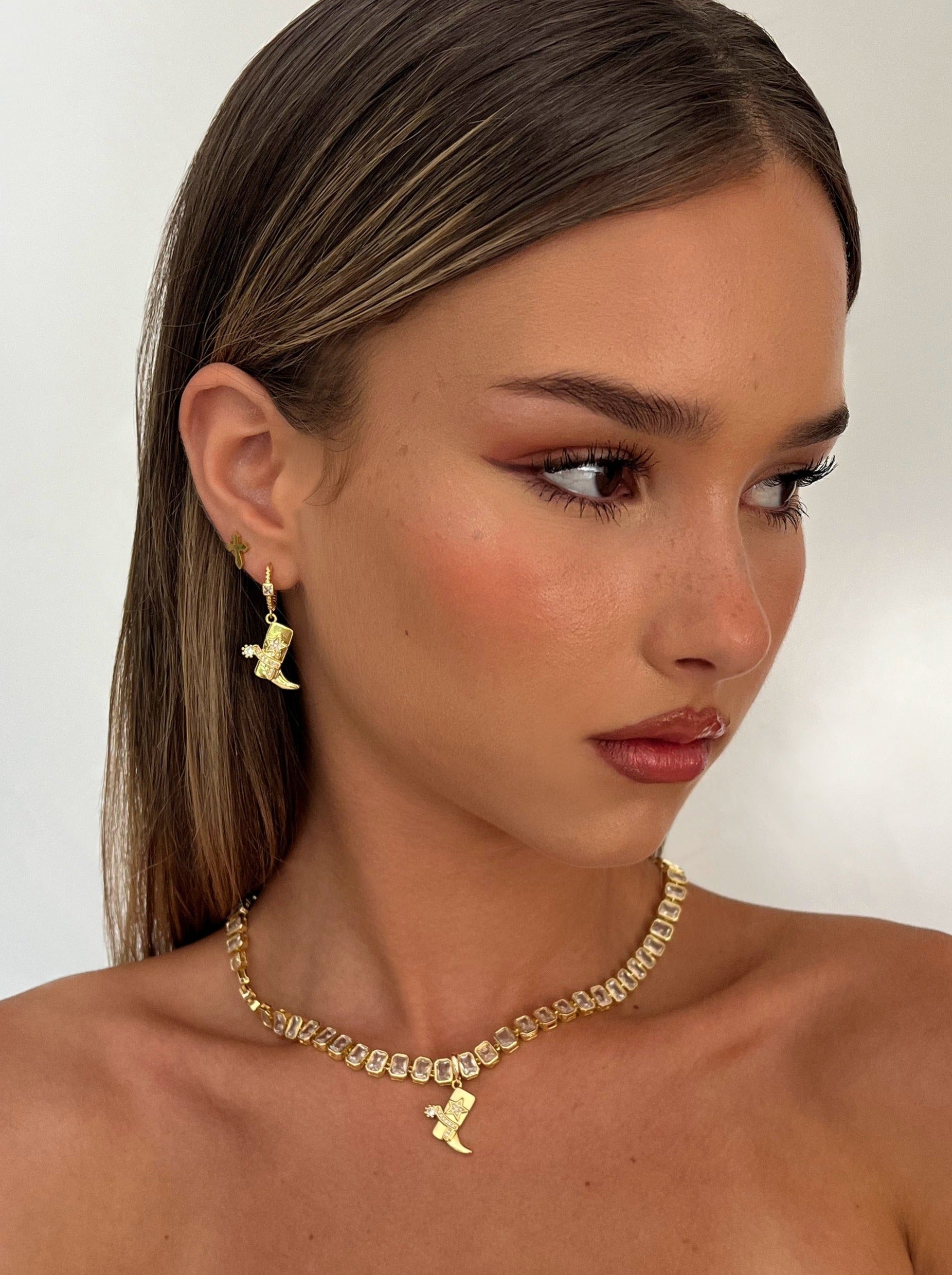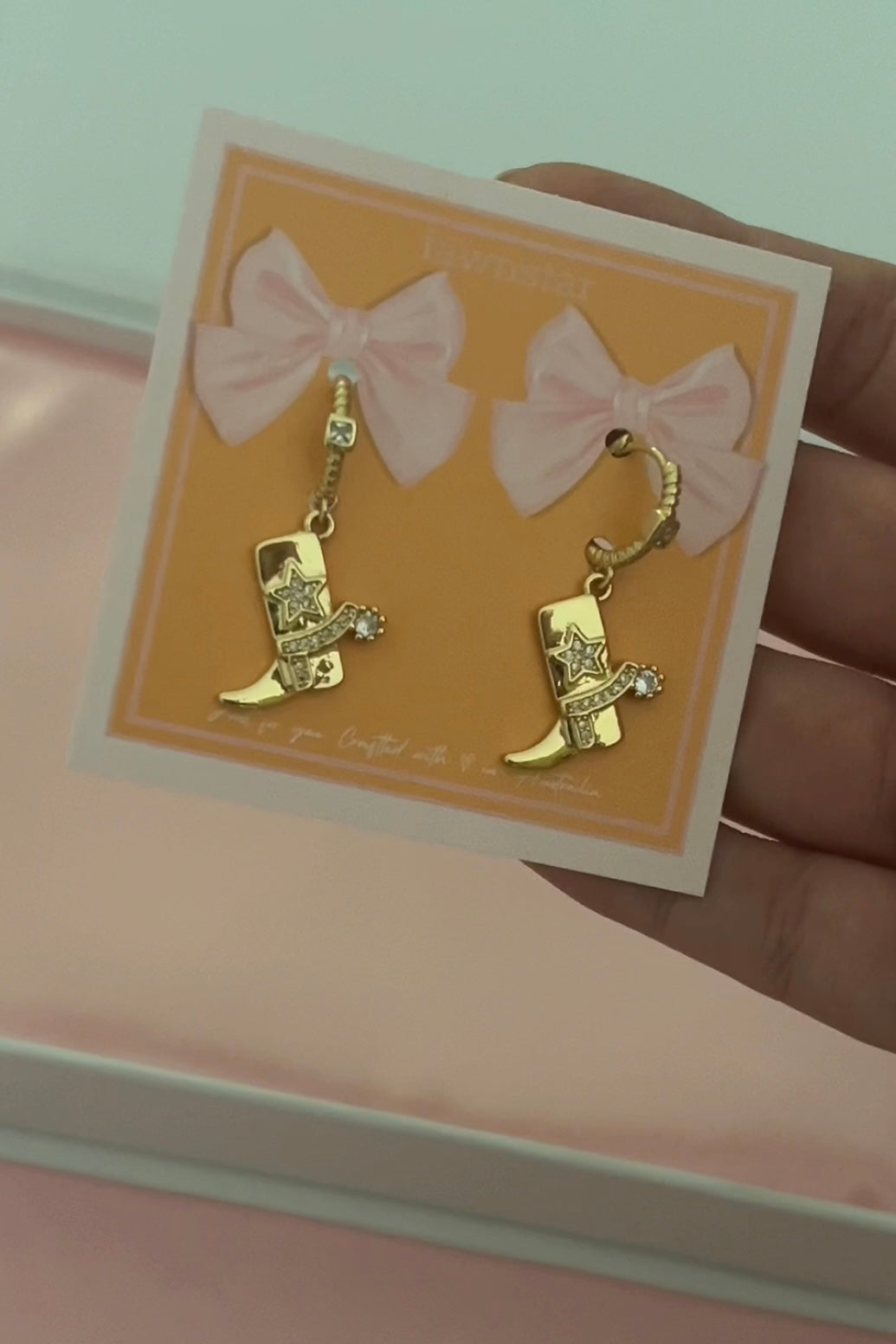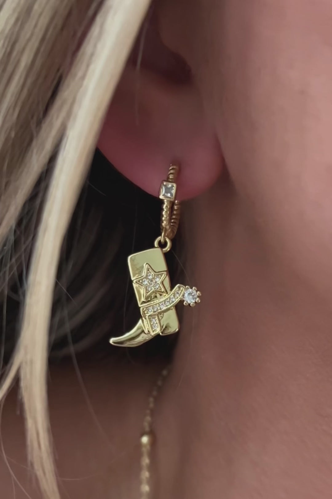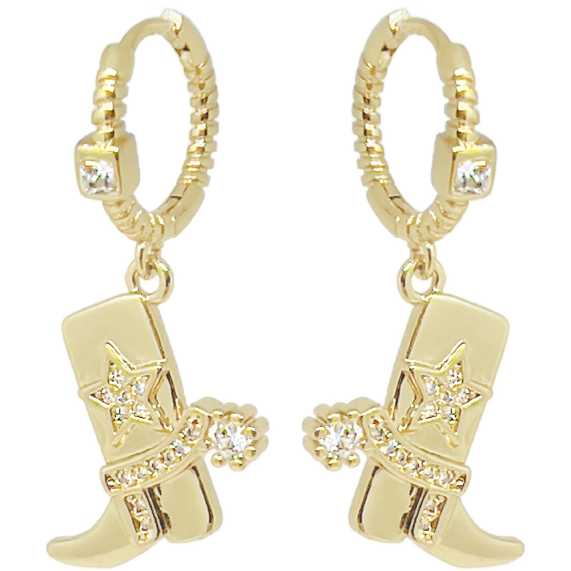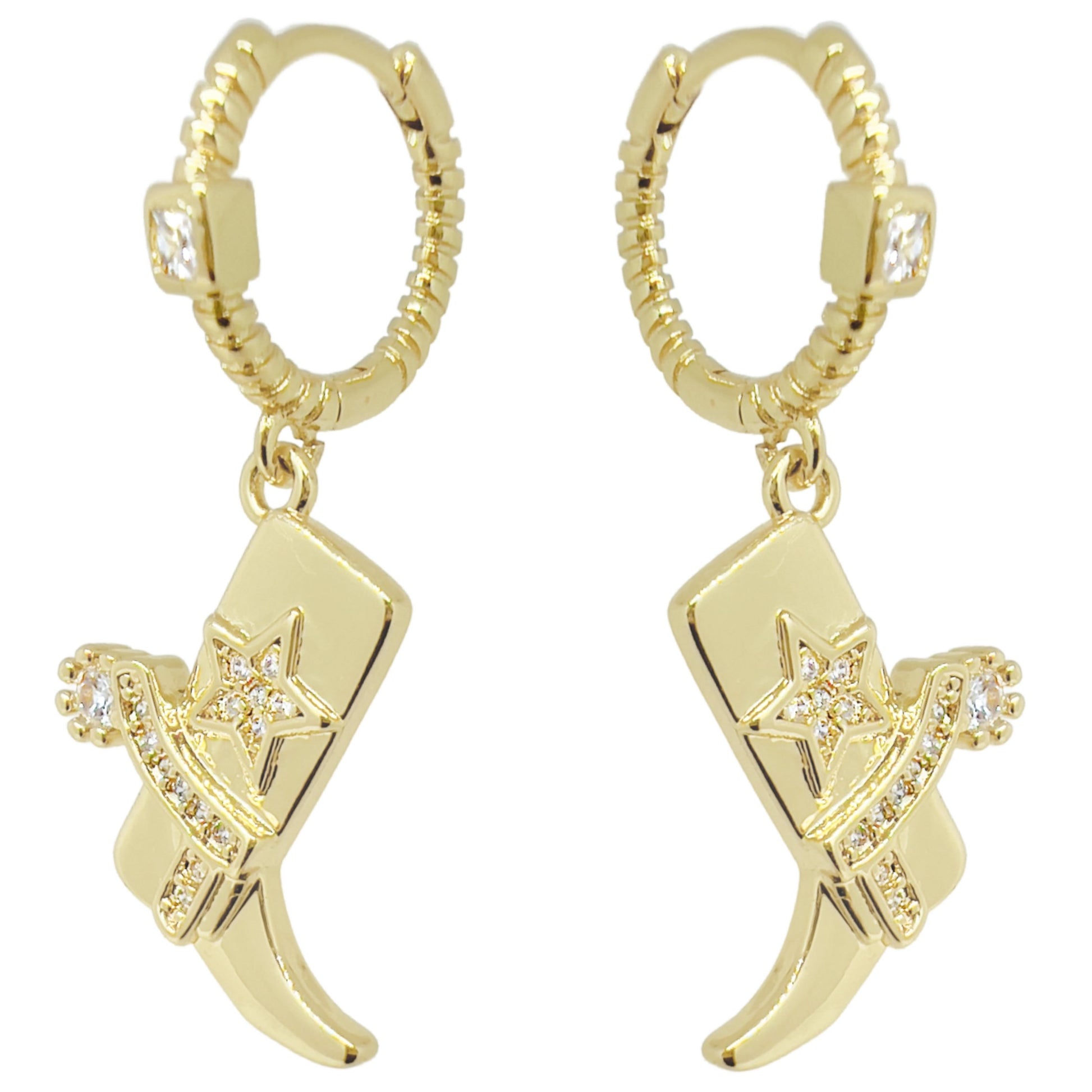 Absolute perfection for any outfit and extremely lightweight design for everyday wear. The Sheriff Sparkle Micro Hoops feature a petite fine twisted hoop embellished with a princess diamond simulant and an 18k gold cowboy boot with diamond simulants.